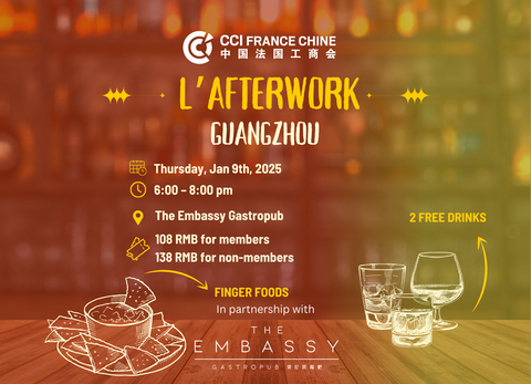 CCI FRANCE CHINE is pleased to invite you to "L'Afterwork Guangzhou", a relaxing moment after a long day at work to gather around and share a moment with colleagues, friends and other members of the Sino-French Business Community.