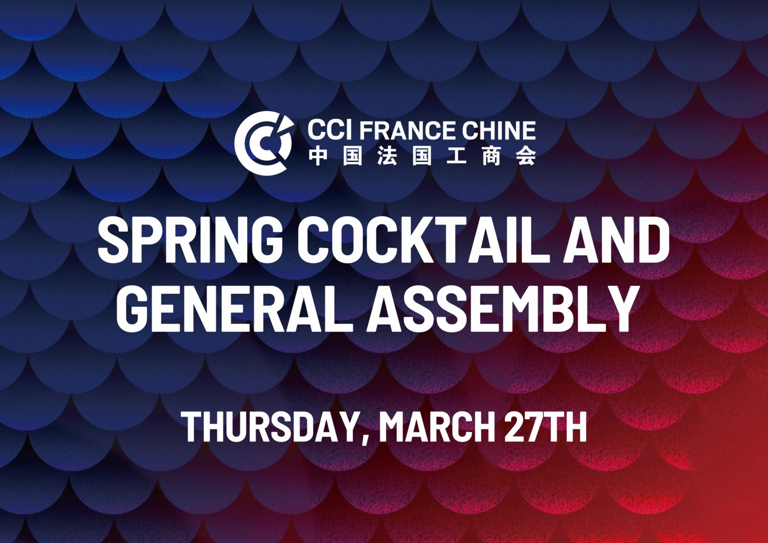 We are pleased to invite you to the Members of the CCI FRANCE CHINE's Ordinary General Assembly, which will take place on Thursday, March 27th, at 6:00 pm in Beijing, Shanghai, Guangzhou and online.