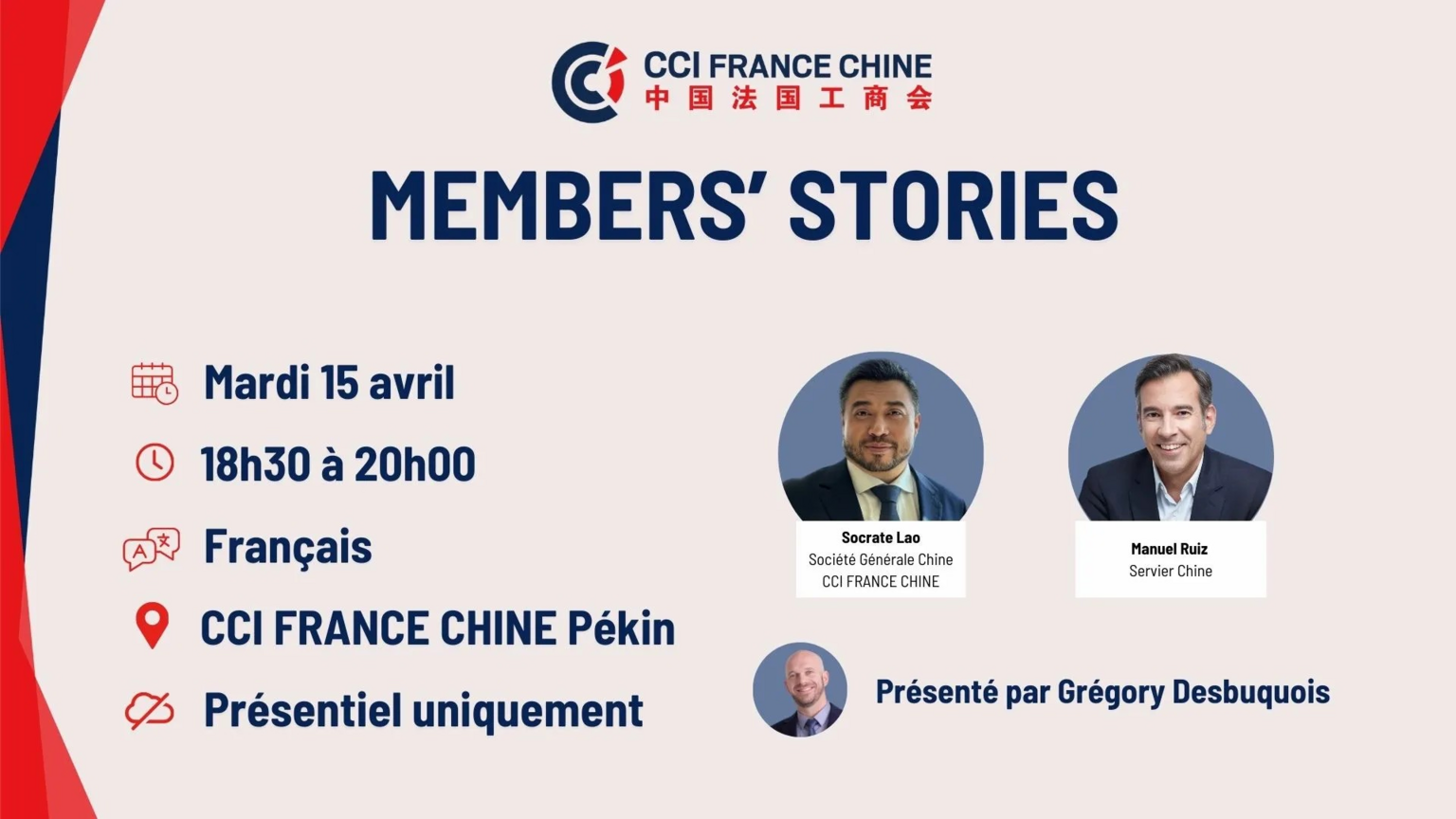 La CCI FRANCE CHINE a le plaisir de vous convier à la grande première de son nouveau format, Members' Stories, un rendez-vous exclusif imaginé pour favoriser des échanges sans filtre dans une ambiance conviviale. Notre coordinateur Grégory Desbuquois recevra deux invités de marque du monde des affaires franco-chinois pour discuter, en tête à tête, de leurs parcours exceptionnels et de leurs projets en Chine.