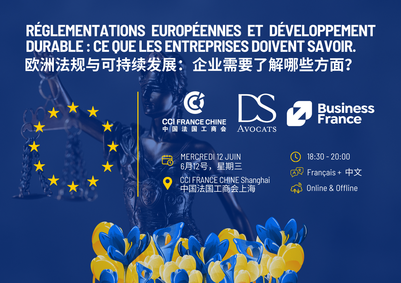 欢迎参加由法国德尚律师事务所(DS Avocats)、中国法国工商会(CCI France Chine)和法国驻华大使馆商务投资处(Business France)共同举办的中法交流活动。活动将致力于探讨关于欧洲在可持续发展、去碳化以及更广泛的环境、社会和公司治理(ESG)问题方面的法规。