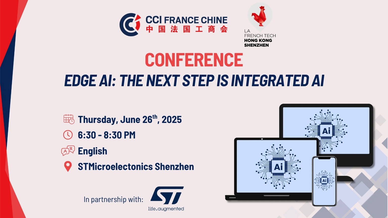 CCI FRANCE CHINE and La French Tech Hong Kong - Shenzhen are proud to co-host a conference with STMicroelectronics to present you the latest trends and advancements on Edge AI.