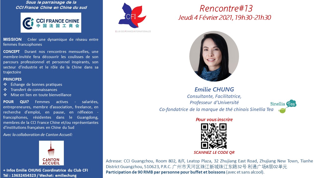 Le CFI a pour mission de créer une dynamique de réseau entre femmes. Durant les rencontres mensuelles une membre-invitée fera découvrir les coulisses de son parcours professionnel et personnel inspirants, son secteur d’industrie et le rôle de la Chine dans sa trajectoire.