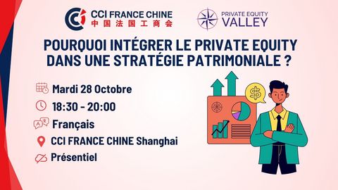 Le mercredi 29 Octobre, Private Equity Valley tiendra une permanence patrimoniale à la CCI France Chine pour vous proposer un bilan personnalisé et un échange stratégique individuel autour de vos projets d’investissement et de transmission.