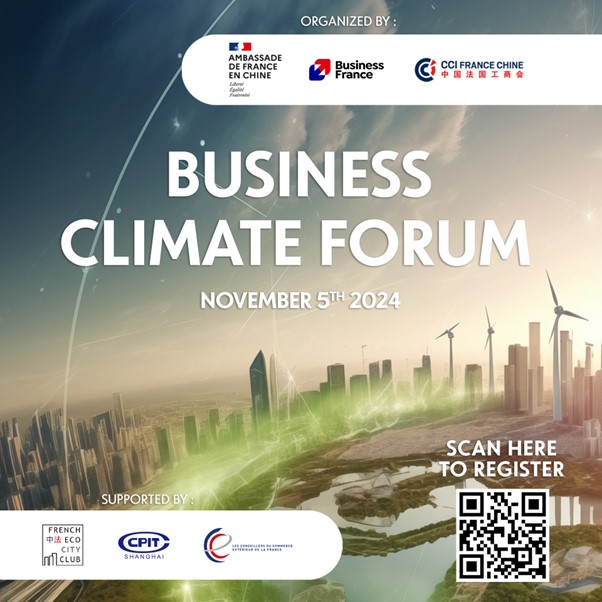 Co-hosted by the Embassy of France in China, CCI FRANCE CHINE and Business France, we are pleased to announce the Sino French Climate Business Forum 2024. This event, supported by the China Council for the Promotion of International Trade (CCPIT) and French Foreign Trade Advisors (CCE), will bring together top business leaders, policymakers, experts, and high ranking officials from both France and China, including the presence of a French Minister to discuss innovative strategies for achieving a carbon-free future.