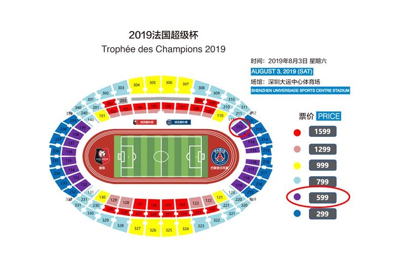 A l’occasion du Trophée des Champions qui se tiendra le 3 août à Shenzhen, le Consulat Général de France à Canton et la CCI FRANCE CHINE ont pré-réservé 200 places pour la communauté française. Venez suivre le match PSG-Rennes à Shenzhen dans une ambiance festive dans la tribune 112 (599 RMB), à côté du Fan Club du PSG (tribunes 113-114-115). Vous pouvez acheter les places directement via ce lien en anglais : https://en.damai.cn/event/tickets_178053/