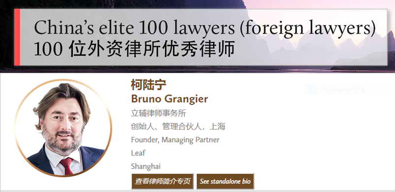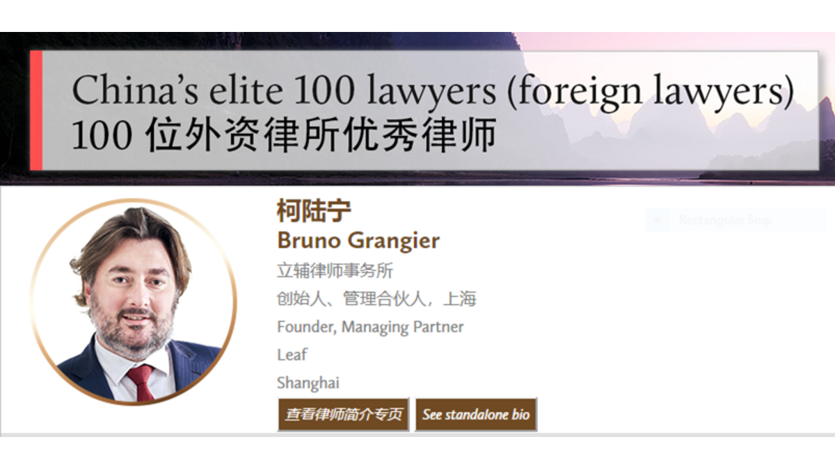 China Business Law Journal has selected a list of China’s Elite 100 Lawyers, including Bruno Grangier, Senior Partner at Leaf.