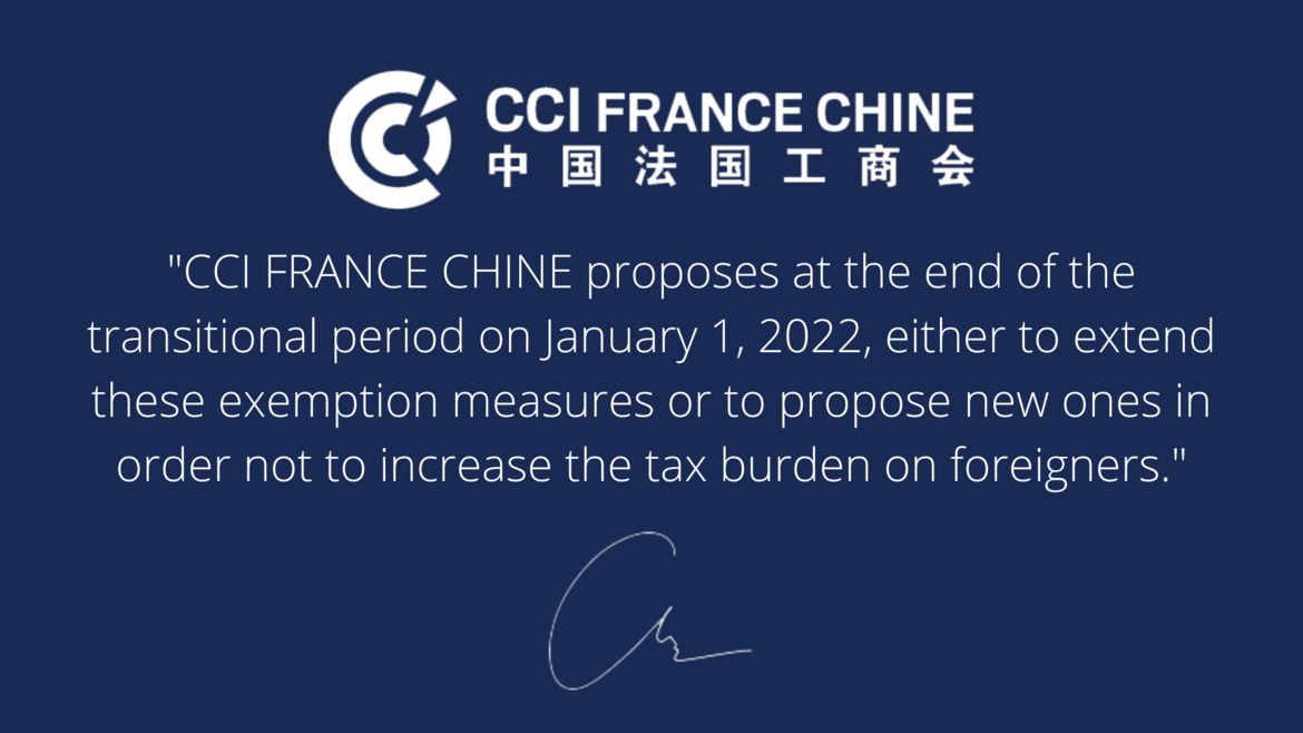 Consequently, the CCI FRANCE CHINE proposes at the end of the transitional period on January 1, 2022, either to extend these exemption measures or to propose new ones in order not to increase the tax burden on foreigners. These new measures could be proposed at the regional level.