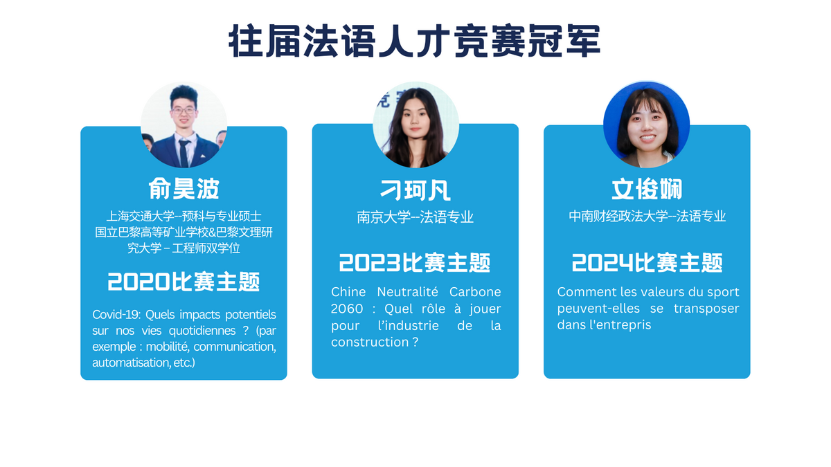 法语人才竞赛是由中国法国工商会于2013年创办,联合法国驻华大使馆共同举办的演讲比赛,旨在以答辩及展示的方式检验学生思辨能力及法语运用能力。