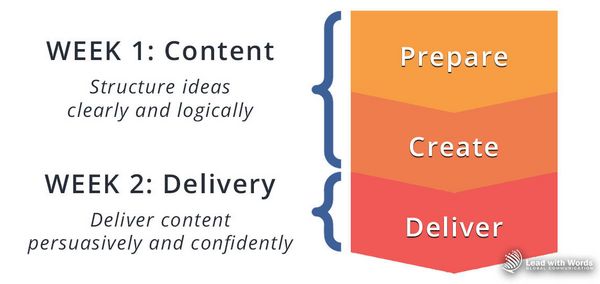 The first week they focus on content: how to structure ideas clearly and logically. The second week they focus on delivery: how to deliver content persuasively and confidently.