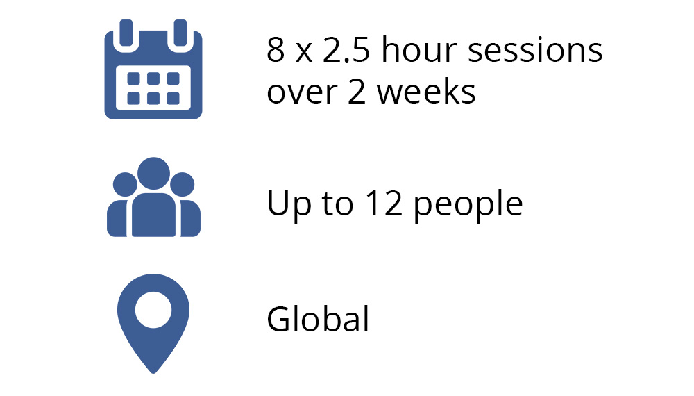 They’ll have 2 weeks with your people, which include 8 x 2.5-hour sessions via Zoom. There's a maximum of 12 people to keep it personal and very interactive.